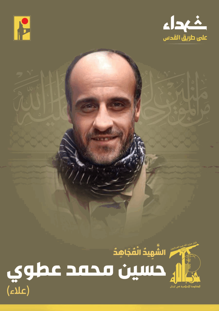 كما نعى الحزب في بيان آخر"الشهيد المجاهد حسين محمد عطوي "علاء" مواليد عام 1970 من بلدة حولا في جنوب لبنان، والذي ارتقى شهيداً على طريق القدس."
