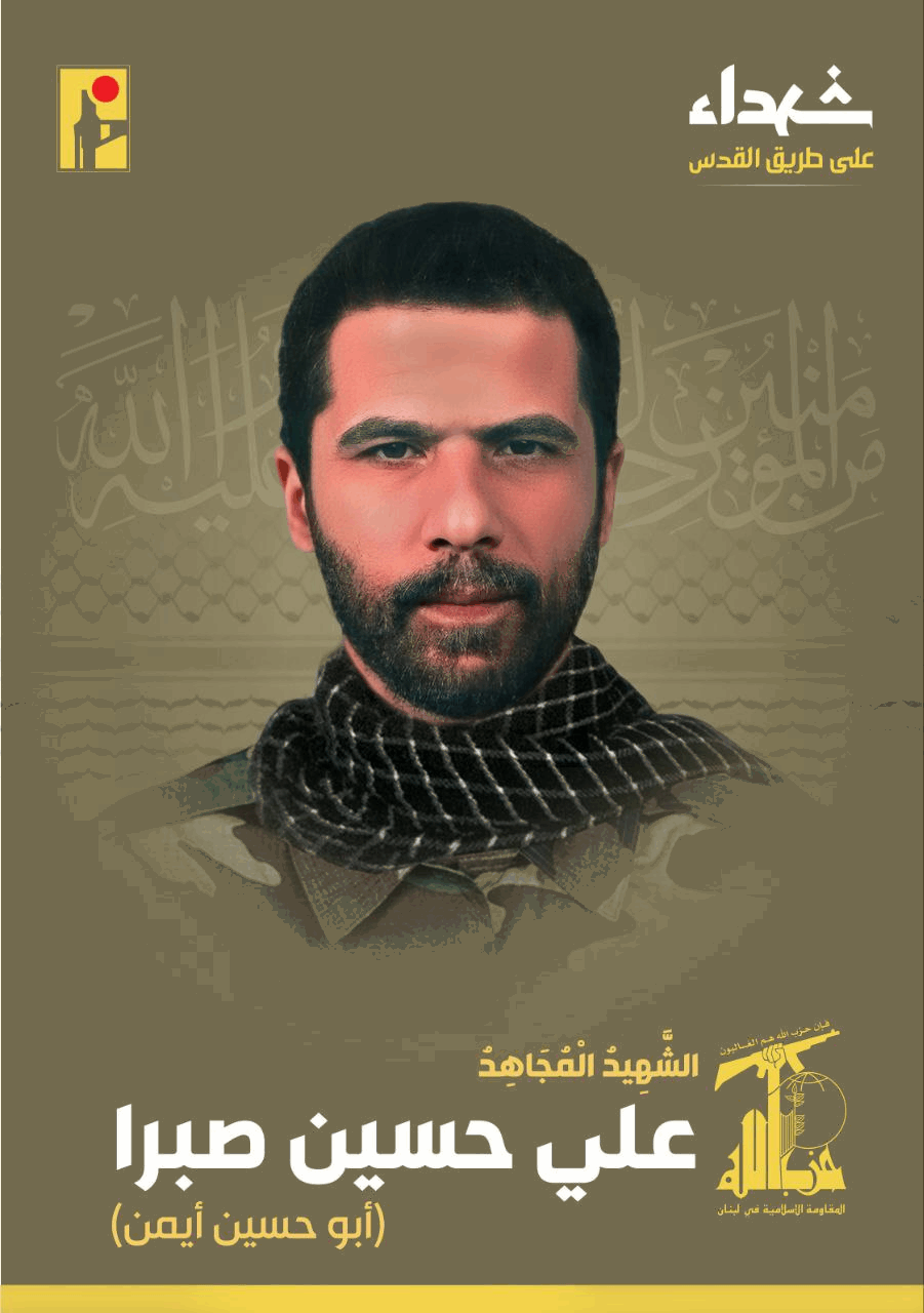اصدر حزب الله بياناً جاء فيه: "بمزيد من الفخر والإعتزاز، تزف المقاومة الإسلامية الشهيد المجاهد علي حسين صبرا "أبو حسين أيمن" مواليد عام ١٩٧٥ من مدينة بيروت وسكان بلدة البابلية في جنوب لبنان، والذي ارتقى شهيداً على طريق القدس."