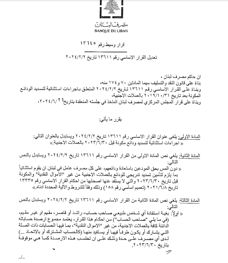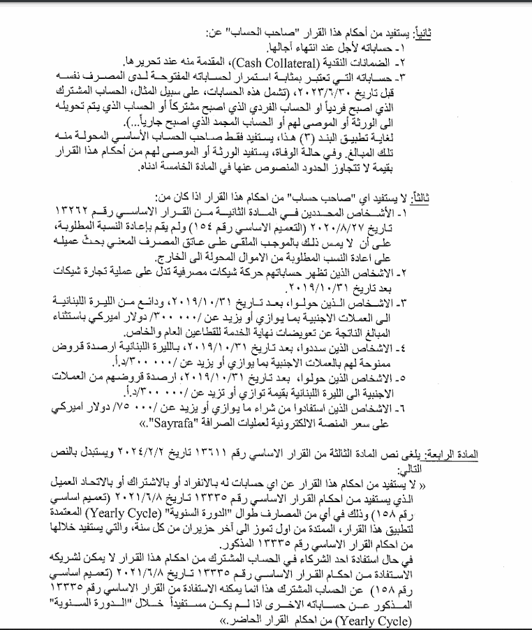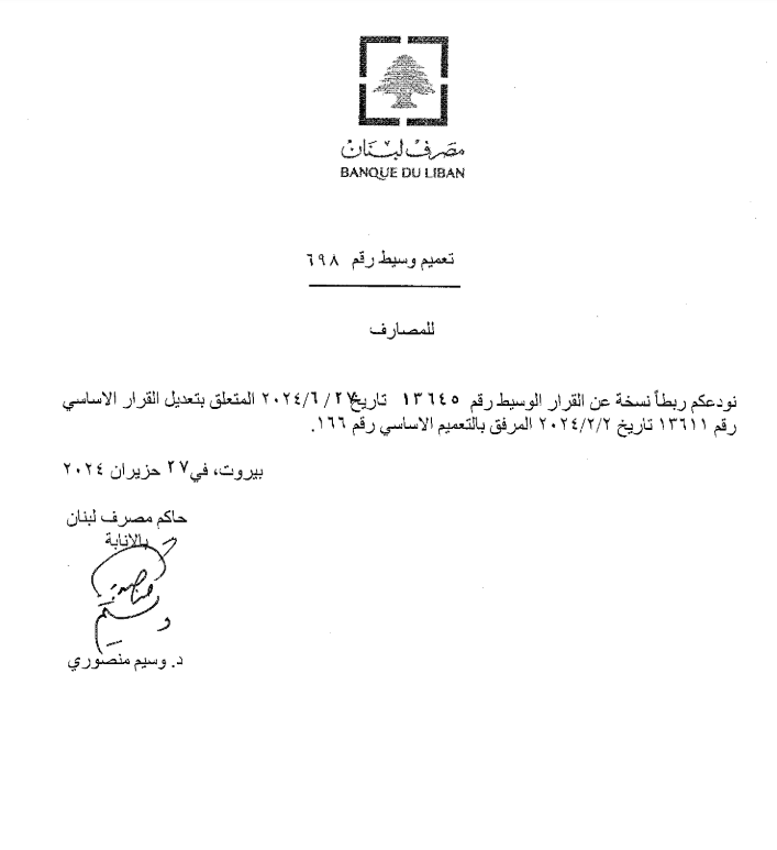 تجديد العمل بالتعميمين الأساسيين 158 و166 لمدة سنة واحدة قابلة للتجديد، اعتباراً من 1 تموز 2024.