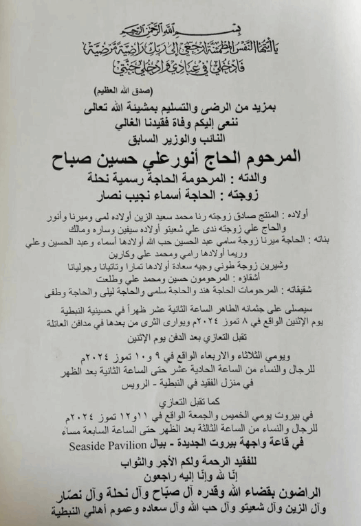 وسيصلى على جثمان الراحل ظهر اليوم في حسينية النبطية .