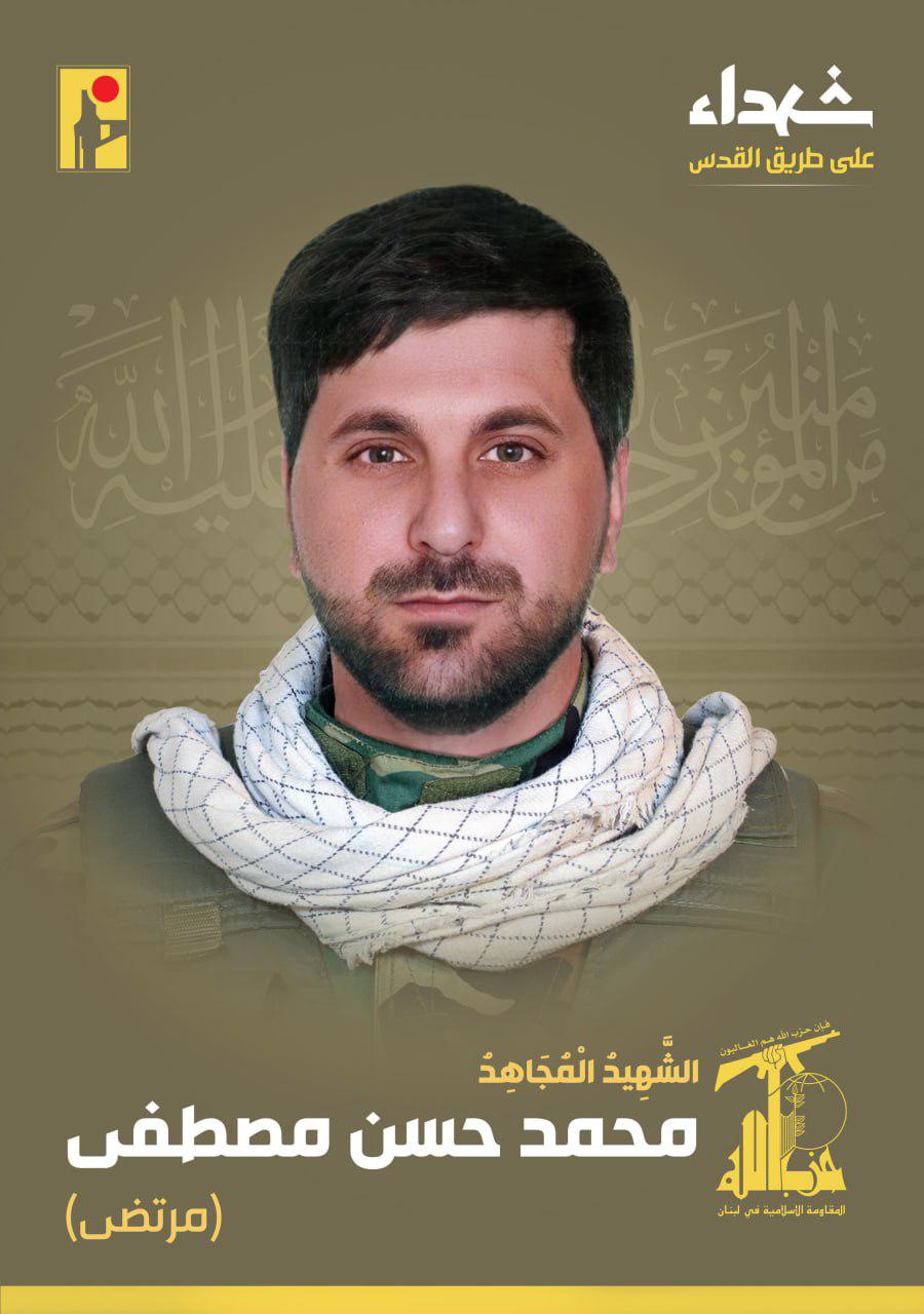 بمزيد من الفخر والإعتزاز، تزف المقاومة الإسلامية الشهيد المجاهد محمد حسن مصطفى "مرتضى" مواليد عام ١٩٨٧ من بلدة عيترون في جنوب لبنان، والذي ارتقى شهيداً على طريق القدس".
