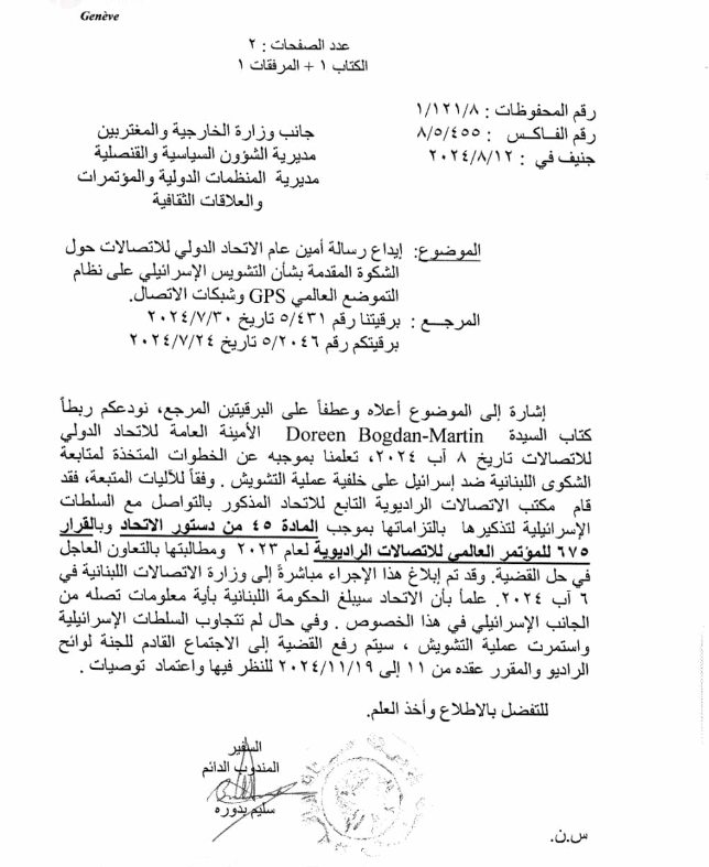 وأشار الكتاب إلى أن الاتحاد قد قام بتبليغ وزارة الاتصالات هذا الاجراء، كما سيبلّغ الحكومة اللبنانية بأية معلومة قد تصله من الجانب الإسرائيلي.