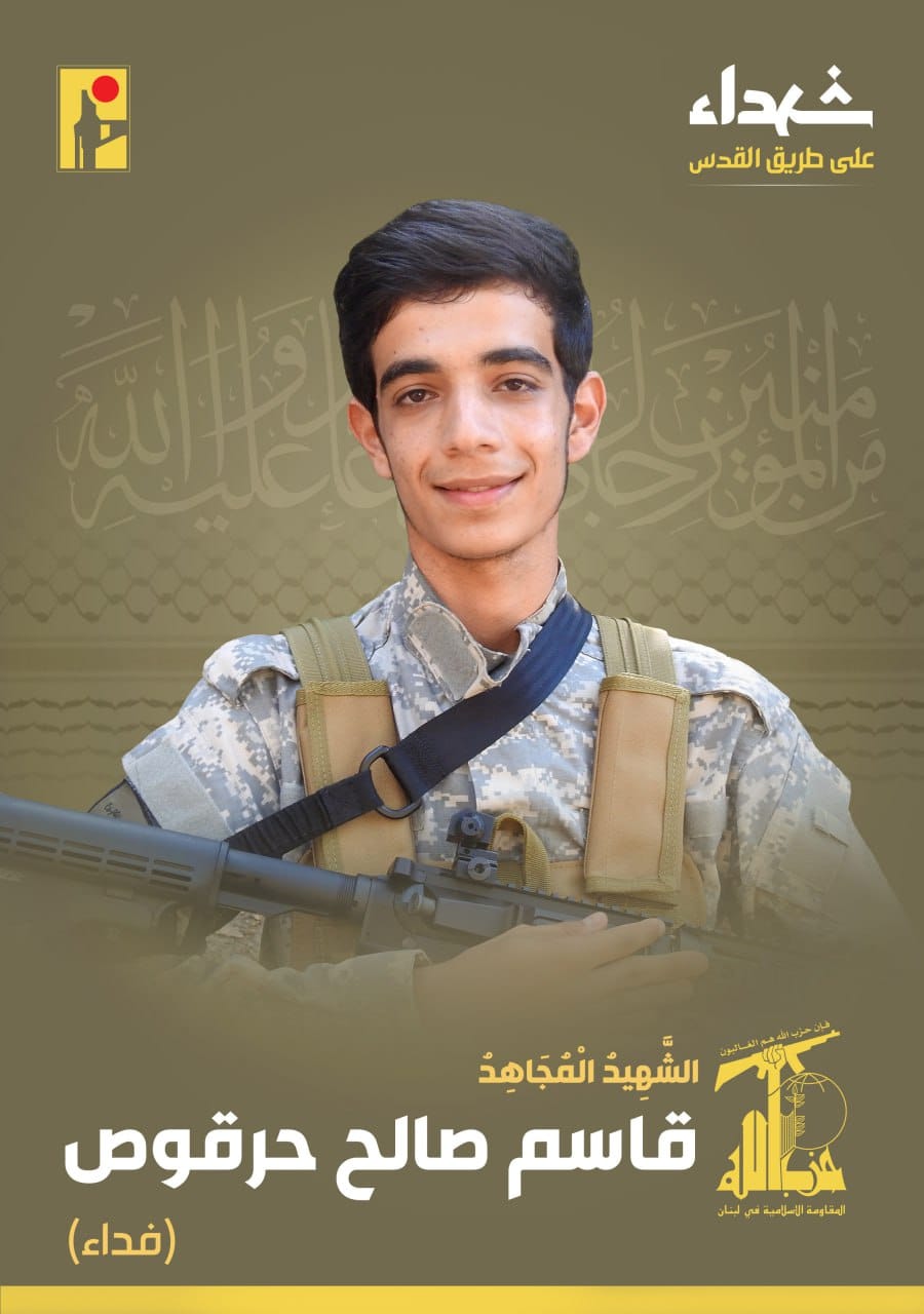 قاسم صالح حرقوص "فداء" مواليد عام 2004 من بلدة طورا في جنوب لبنان، والذي ارتقى شهيداً على طريق القدس.