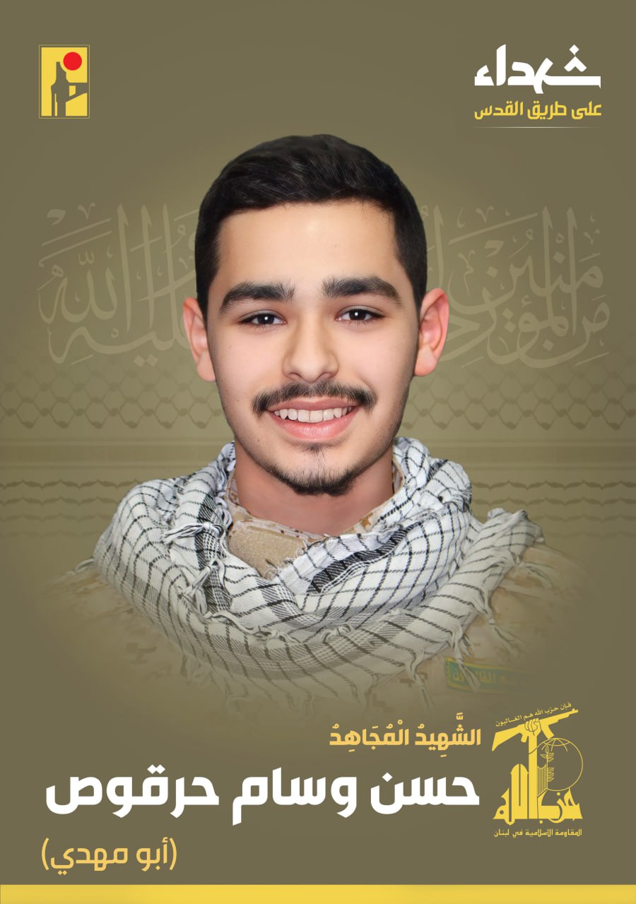 "بمزيد من الفخر والإعتزاز، تزف المقاومة الإسلامية الشهيد المجاهد حسن وسام حرقوص "