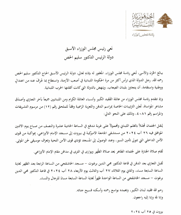 ، مذكرة رسمية جاء فيها: "يتوقف موظفو المديرية العامة لرئاسة مجلس الوزراء والعاملون فيها عن العمل يوم الاثنين الموافق فيه 26/ 8/ 2024، اعتباراً من الساعة الحادية عشرة من قبل الظهر ولغاية الساعة الثانية من بعد الظهر، حداداً على وفاة القامة الوطنية الكبيرة و"ضمير الوطن" المغفور له دولة الرئيس