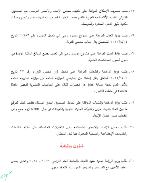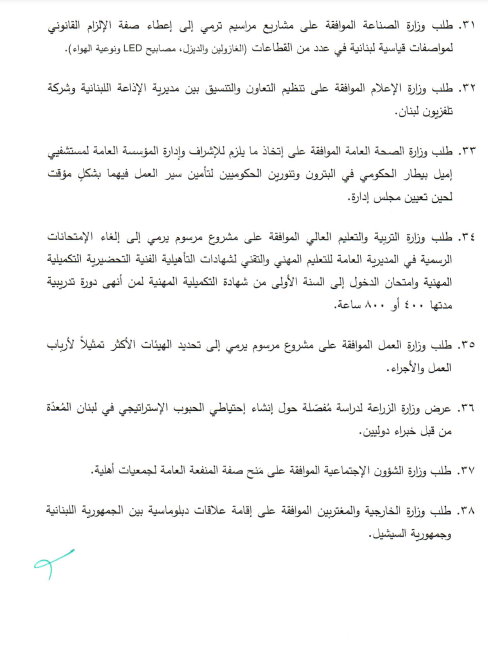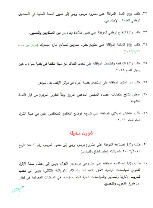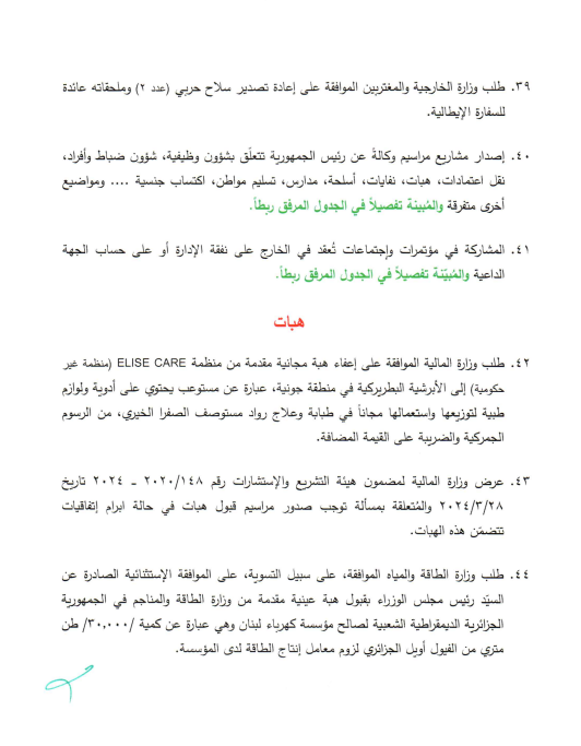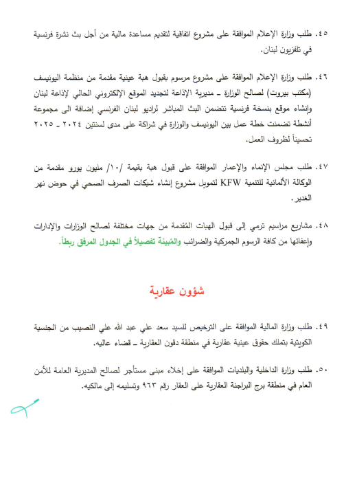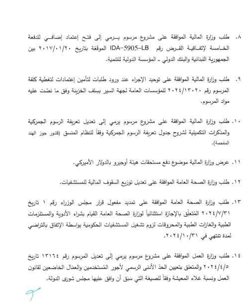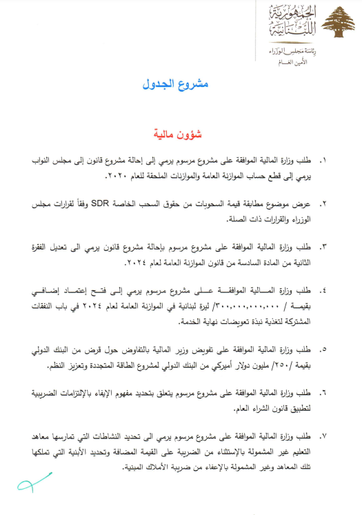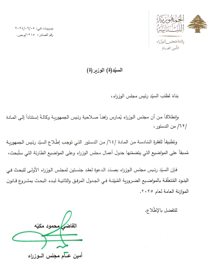 افاد الامين العام لمجلس الوزر ء القاضي محمد مكية بان رئيس حكومة تصريف الاعمال نجيب ميقاتي بصدد الدعوة لعقد جلستين لمجلس الوزراء الاولى للبحث في البنود المتعلقة بالمواضيع الضرورية المبينة في الجدول المرفق، والثانية لبدء البحث بمشروع قانون الموازنة العامة لعام 2025.