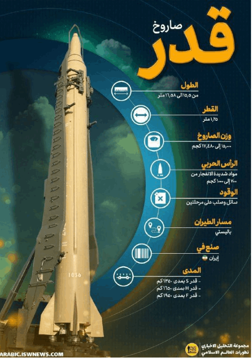 بالصورة .. صاروخ "قادر" البالستي الذي استهدف تل ابيب وابرز مميزاته