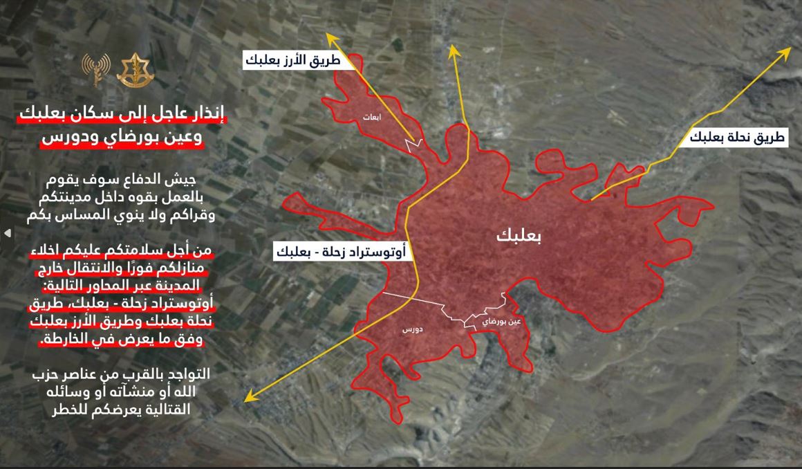 وعين بورضاي ودورس، طالباً إياهم الاخلاء فوراً والانتقال خارج المدينة والقرى عبر أوتوستراد زحلة - بعلبك، وطريق