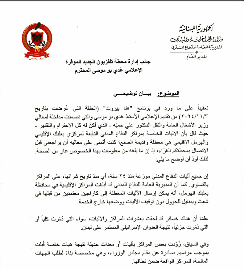 أصدرت المديرية العامة للدفاع المدني، بياناً توضيحياً، تعقيباً على مداخلة وزير الأشغال العامة والنقل علي حميّة في برنامج "هنا بيروت" عبر قناة الجديد.