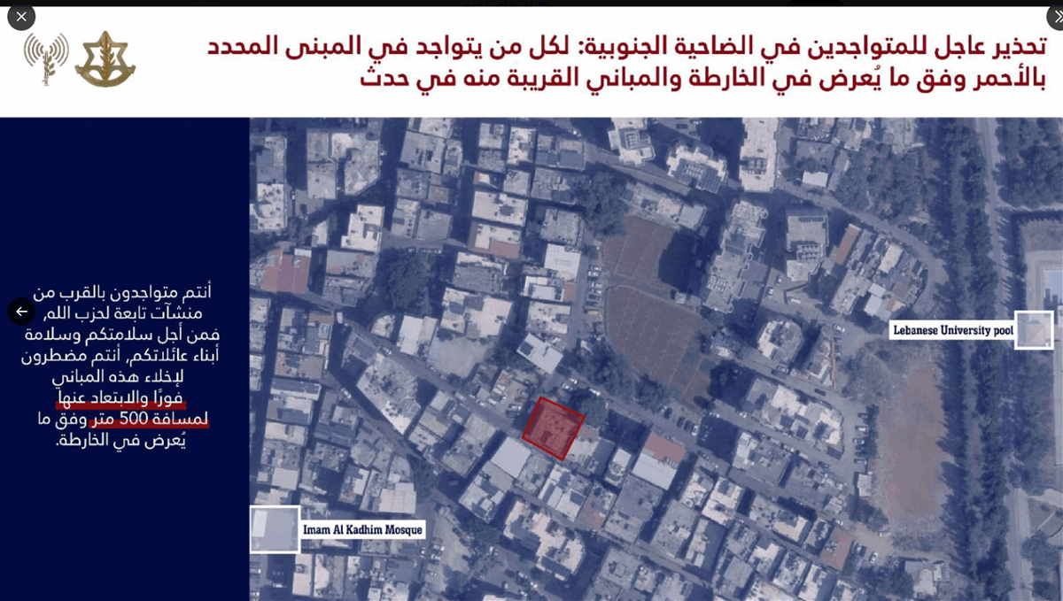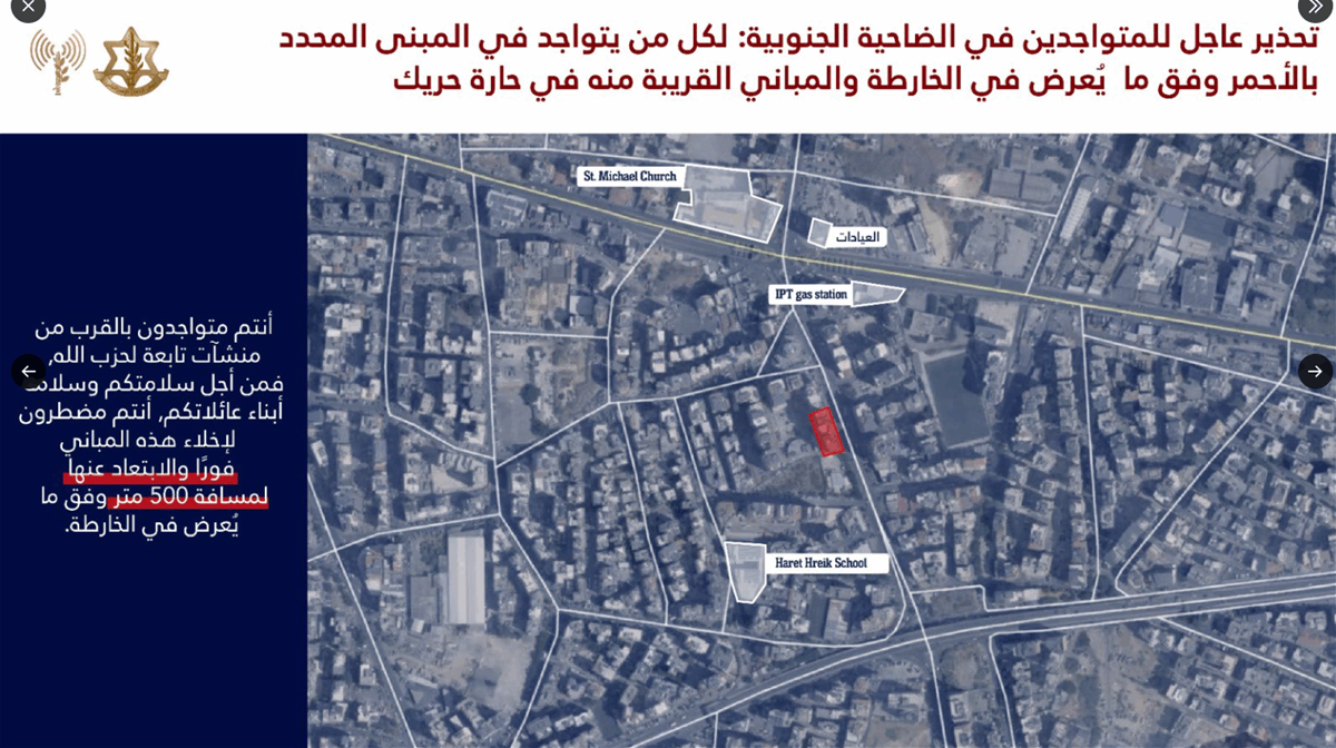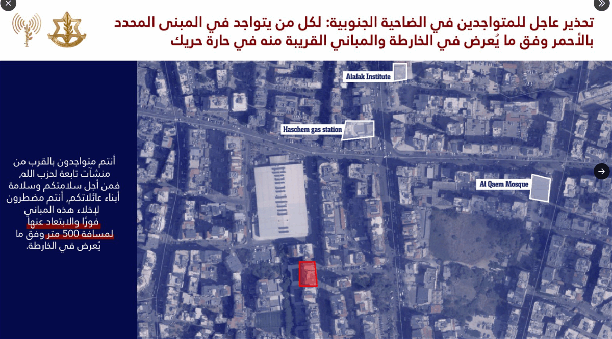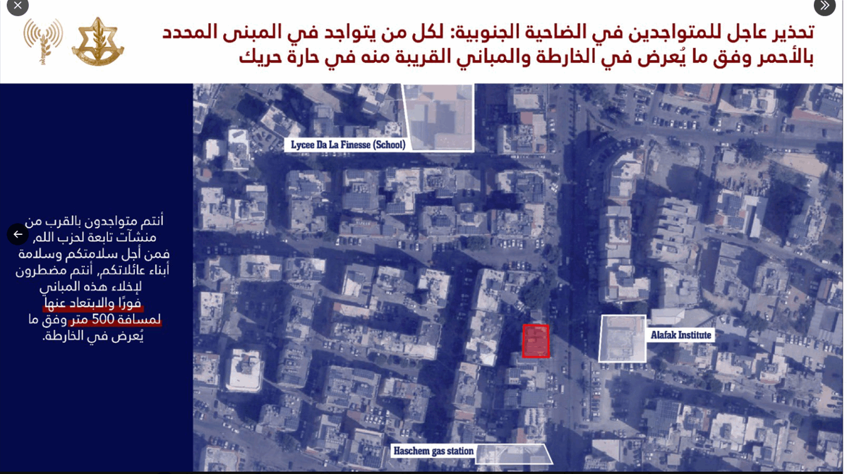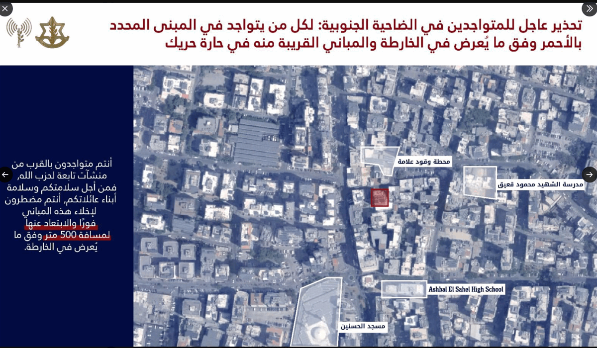 أصدر المتحدث باسم جيش العدو الإسرائيلي افيخاي ادرعي تهديدا جديدة بقصف ابنية عدة في مناطق مناطق حارة حريك والليلكي والغبيري والحدث في الضاحية الجنوبية لبيروت، وهذه الأماكن بالتحديد هي:
