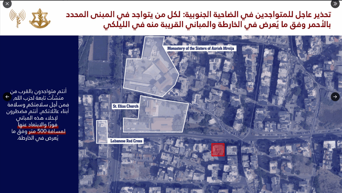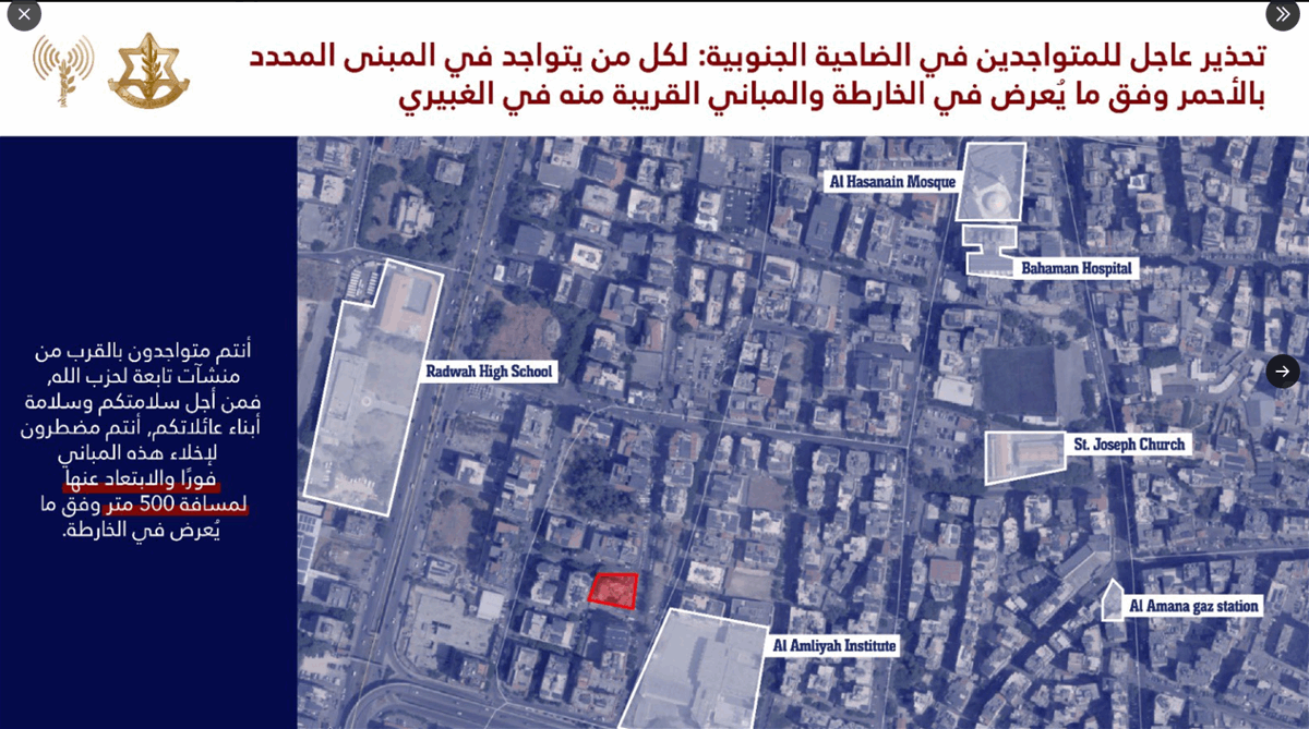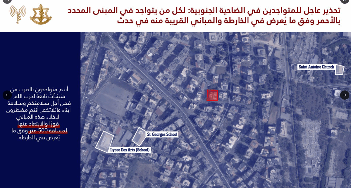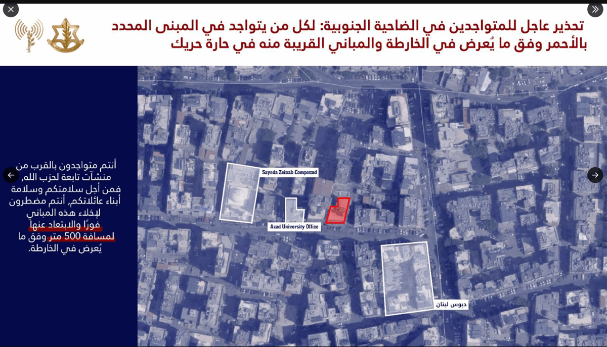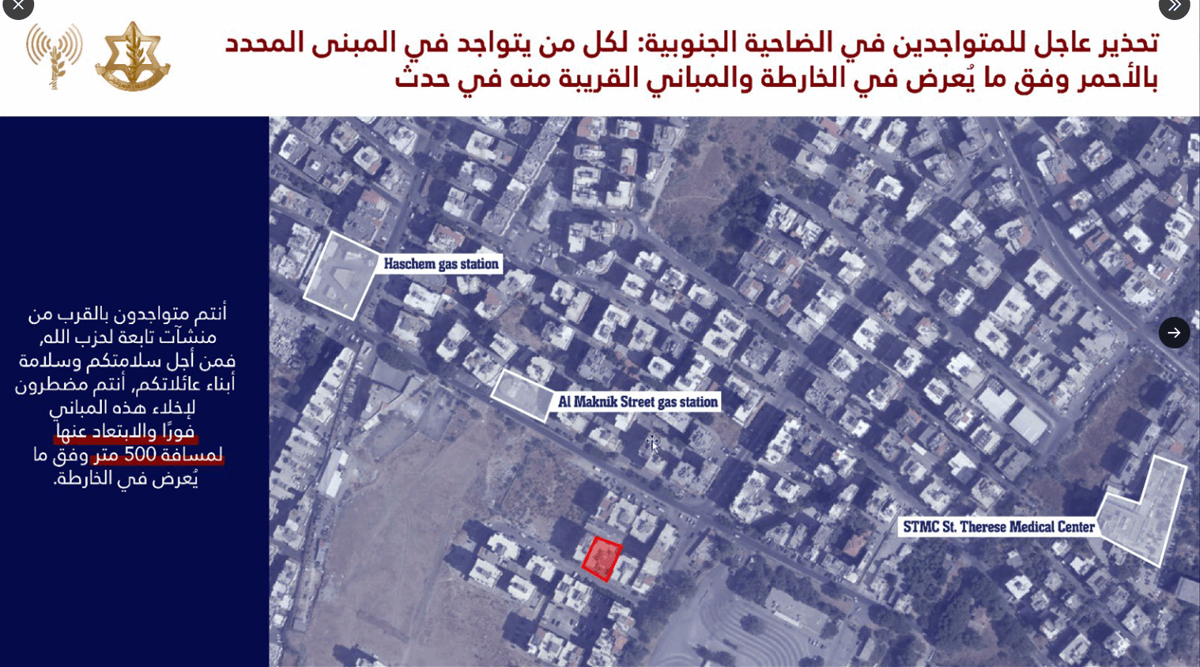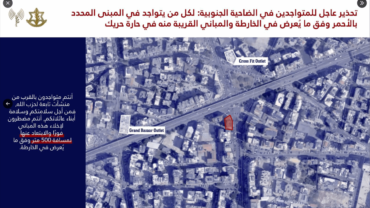 أصدر المتحدث باسم جيش العدو الإسرائيلي افيخاي ادرعي تهديدا جديدة بقصف ابنية عدة في مناطق مناطق حارة حريك والليلكي والغبيري والحدث في الضاحية الجنوبية لبيروت، وهذه الأماكن بالتحديد هي:
