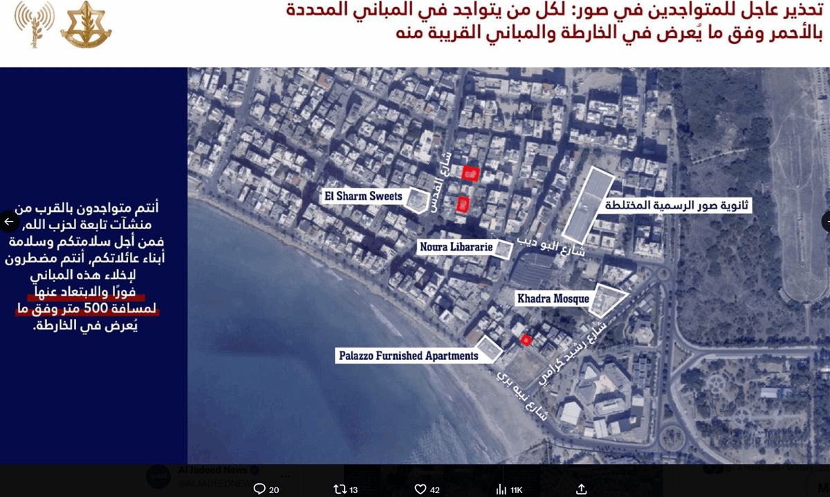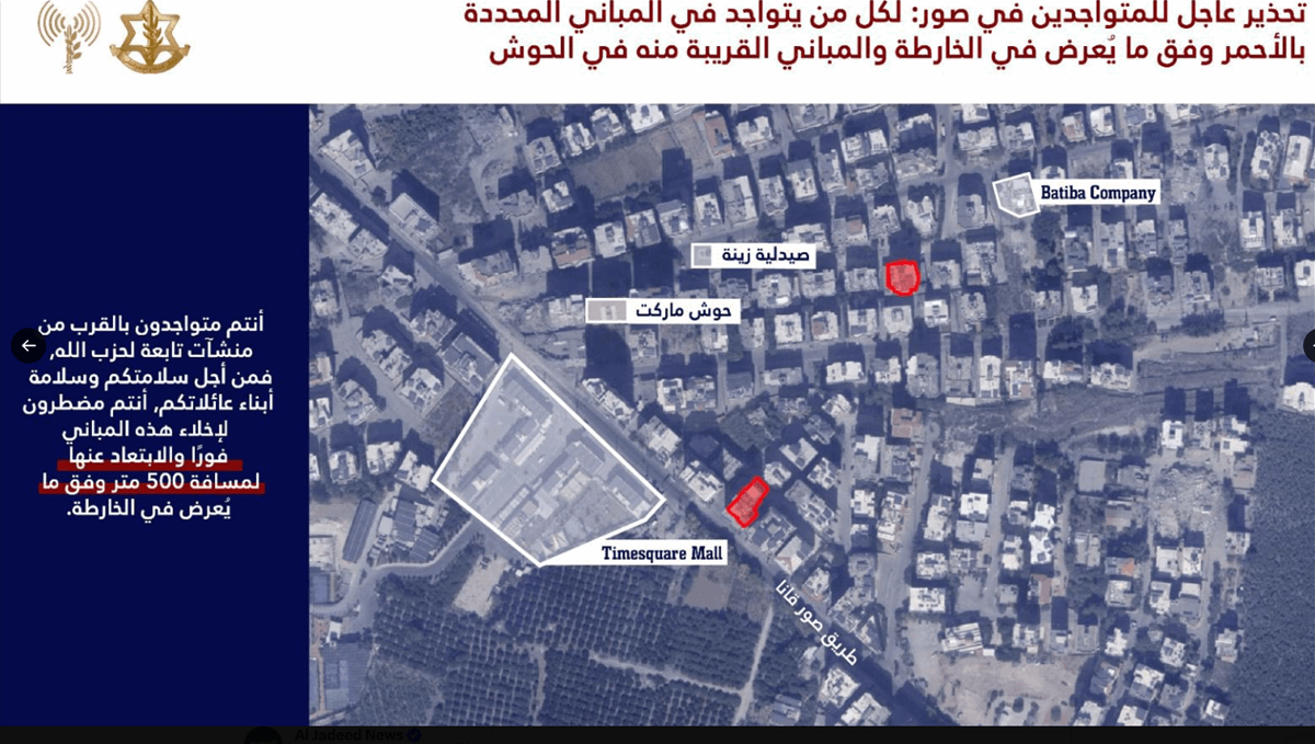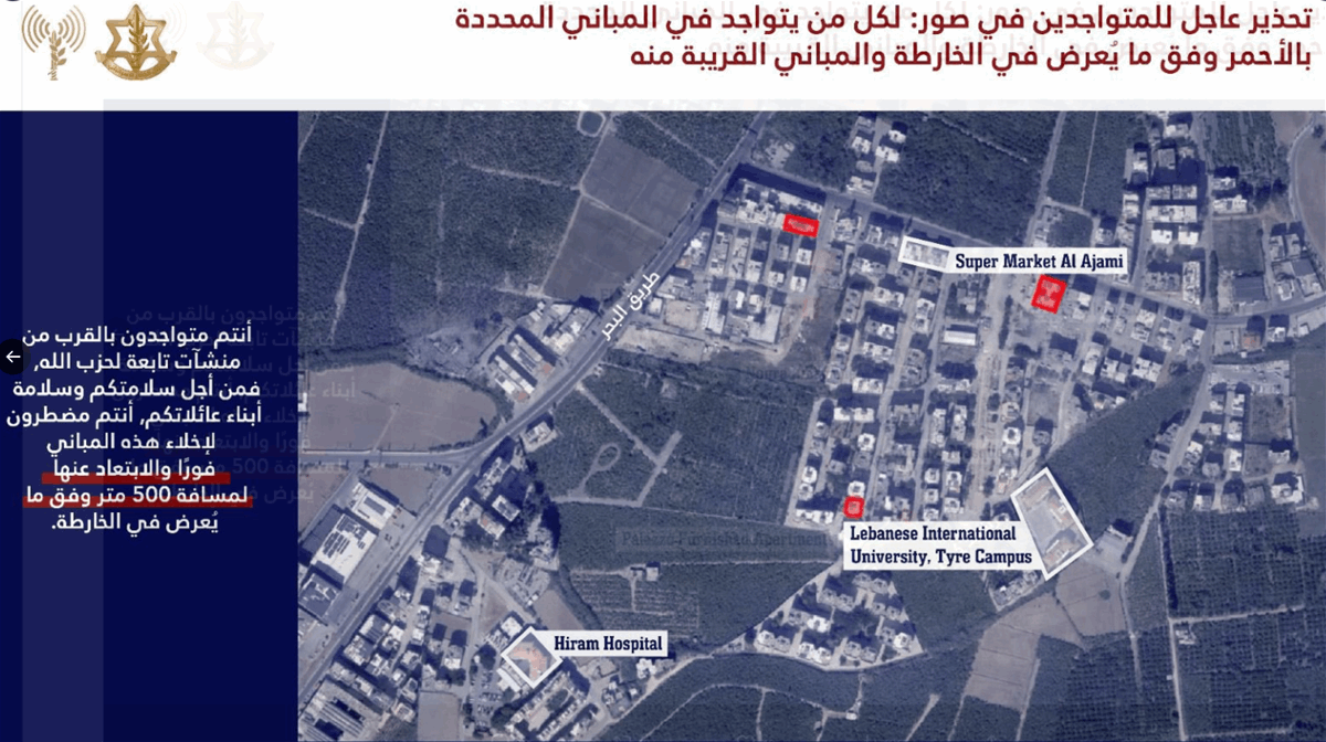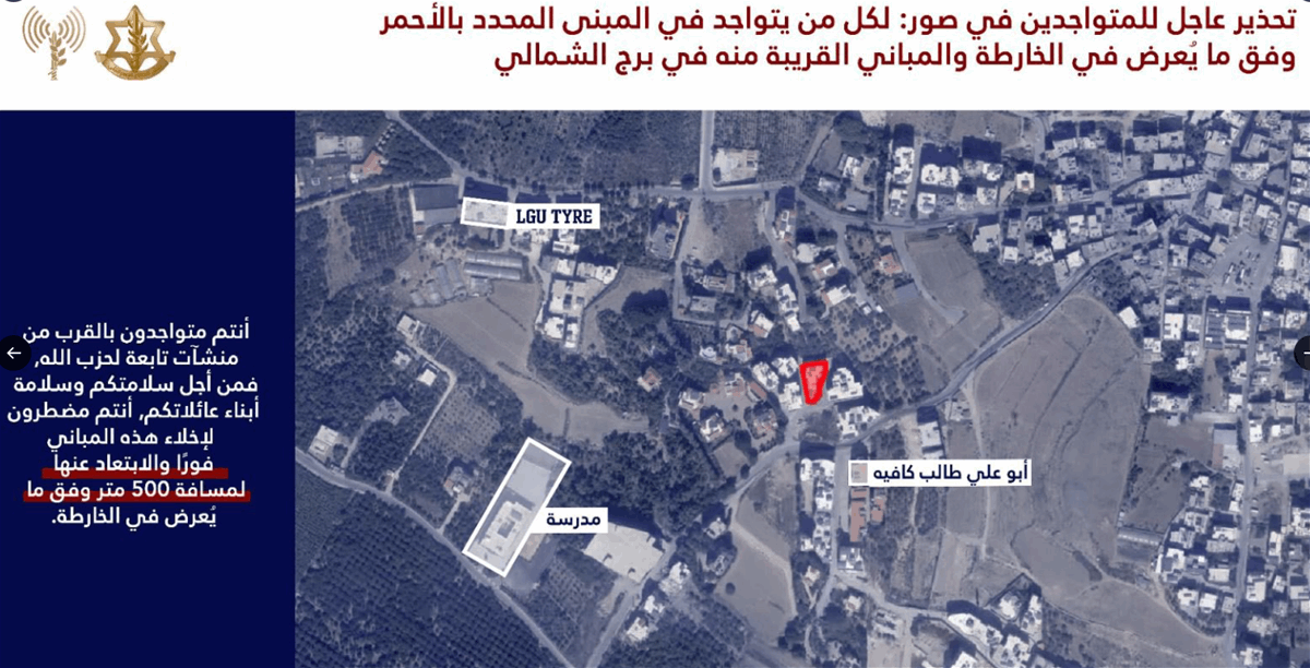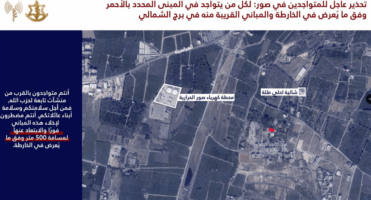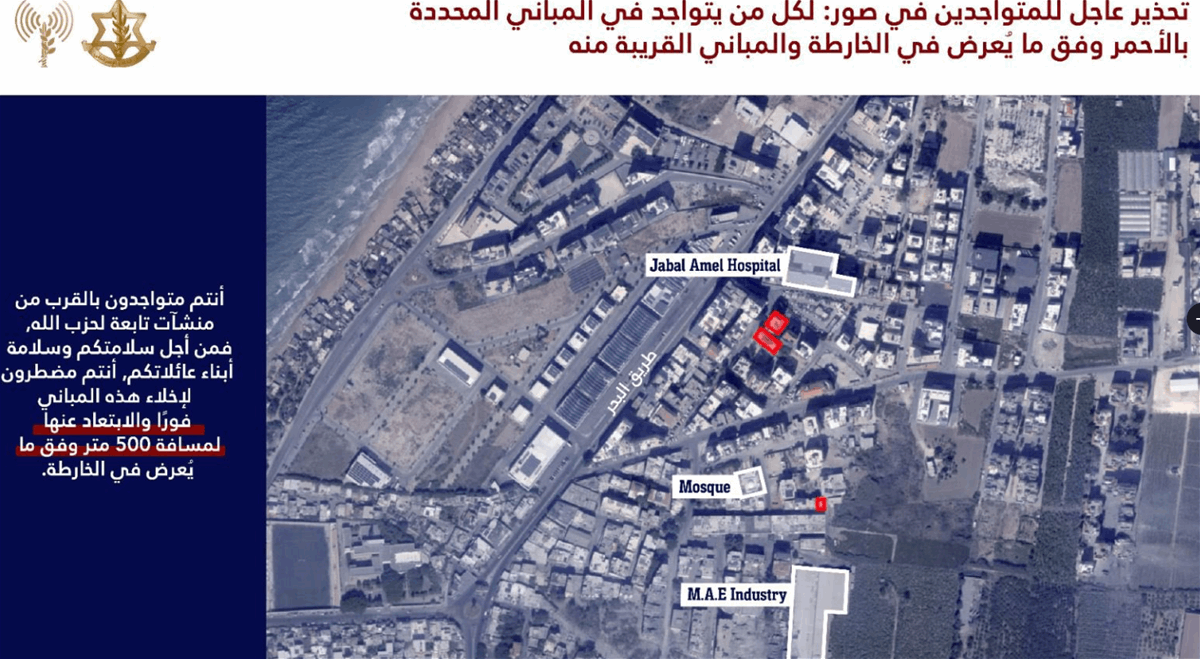 بالصور- جيش العدو يصدر تهديداً بقصف مبان في مدينة صور وفي مناطق برج الشمالي ومعشوق والحوش