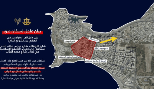 تهديد إسرائيلي جديد لسكان منطقة صور في لبنان وتحديدًا إلى المتواجدين في المباني بين الشوارع: شارع الاوقاف, شارع حيرام, مقام النبي اسماعيل ابن حزقيل, الجامعة الإسلامية في لبنان، شارع محمد الزيات.