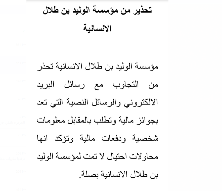 حذرت مؤسسة الوليد بن طلال الإنسانية من التجاوب مع رسائل البريد الإلكتروني والرسائل النصية التي تعد بجوائز مالية وتطلب بالمقابل معلومات شخصية ودفعات مالية وتؤكد أنها محاولات احتيال لا تمت إلى مؤسسة الوليد بن طلال بصلة