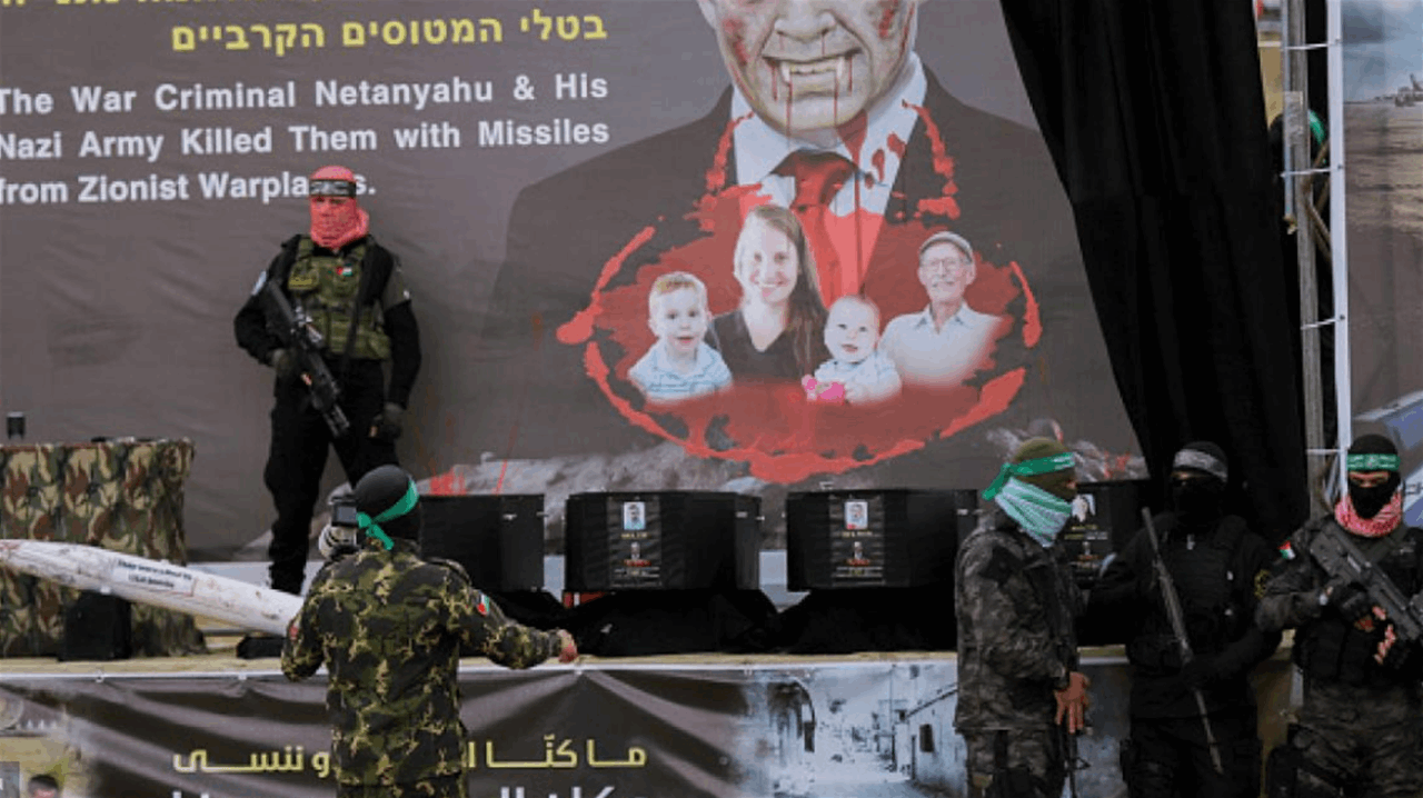 وكان عرض مقاتلون ملثّمون ومسلّحون على منصة في خان يونس في جنوب قطاع غزة أربعة توابيت سود حمل كل منها صورة لأحد الرهائن. ونصبت لافتة تمثّل رئيس الوزراء الإسرائيلي بنيامين نتانياهو كمصاص دماء.