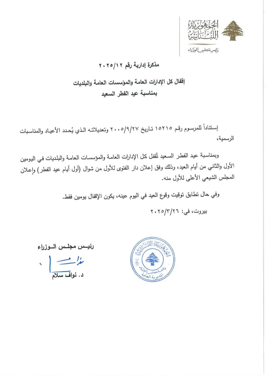 صدر عن رئيس مجلس الوزراء نواف سلام، "إستناداً للمرسوم رقم 15215 تاريخ27-9-2000 وتعديلاته الذي يُحدد الأعياد والمناسبات وبمناسبة عيد الفطر السعيد تقفل كل الإدارات العامة والمؤسسات العامة والبلديات في اليومين الأول والثاني من أيام العيد، وذلك وفق إعلان دار الفتوى للأول من شوال (أول أيام عيد الفطر) وإعلان المجلس الشيعي الأعلى للأول منه.
