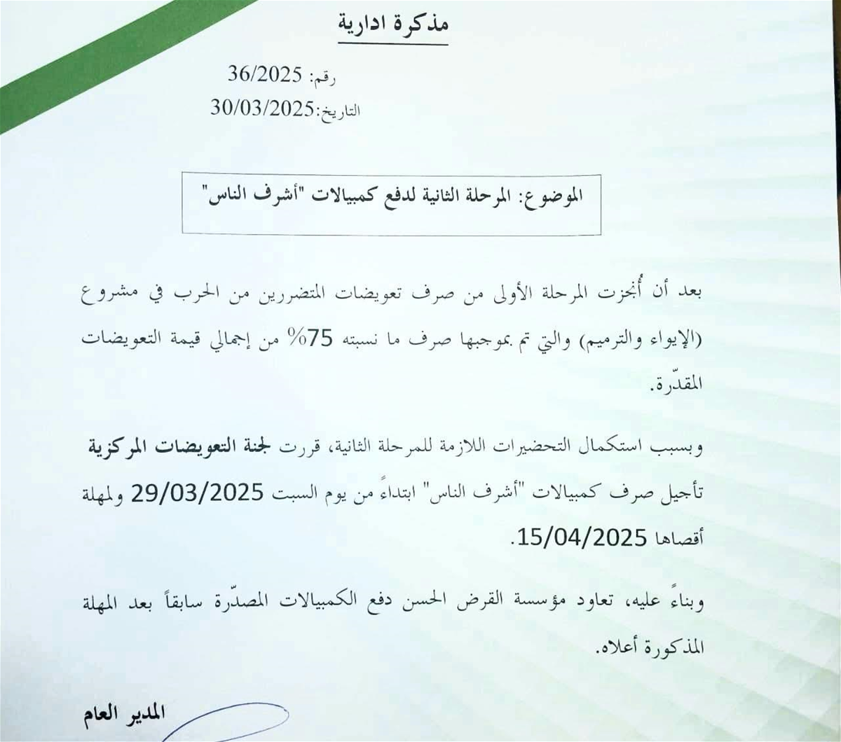 ويأتي هذا التأجيل بعد استكمال المرحلة الأولى، التي تم خلالها صرف 75% من إجمالي التعويضات المخصصة للمتضررين من الحرب في مشروع الإيواء والترميم.