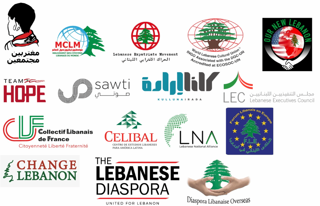 شبكة الاغتراب اللبناني، جمعية الإنتشار اللبناني ما وراء البحار، الجامعة اللبنانية الثقافية في العالم، كلنا ارادة، المنتدى اللبناني في اوروبا، مغتربين مجتمعين، مجلس التنفيذيين اللبنانيين، مواطنون لبنانيون حول العالم، صوتي، الحراك الاغترابي اللبناني، Change Lebanon، Collectif Libanais de France، Lebanese national alliance، Latin American Center For Lebanese Studies، Team Hope،Our New Lebanon