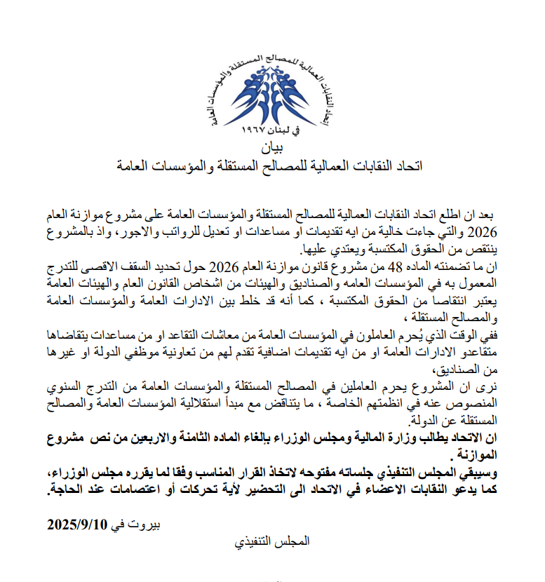 أصدر اتحاد النقابات العمالية للمصالح المستقلة والمؤسسات العامة بياناً طالبت عبره وزارة المالية ومجلس الوزراء بإلغاء المادة الثامنة والأربعين من نص مشروع الموازنة.