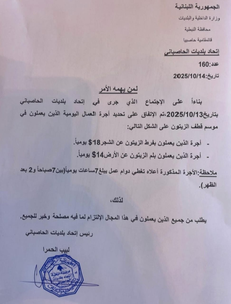 بناءًا على الإجتماع الذي جرى في اتحاد بلديات الحاصباني بتاريخ 13/10/2025، تم الإتفاق على تحديد اجرة العمال اليومية الذين يعملون في موسم قطف