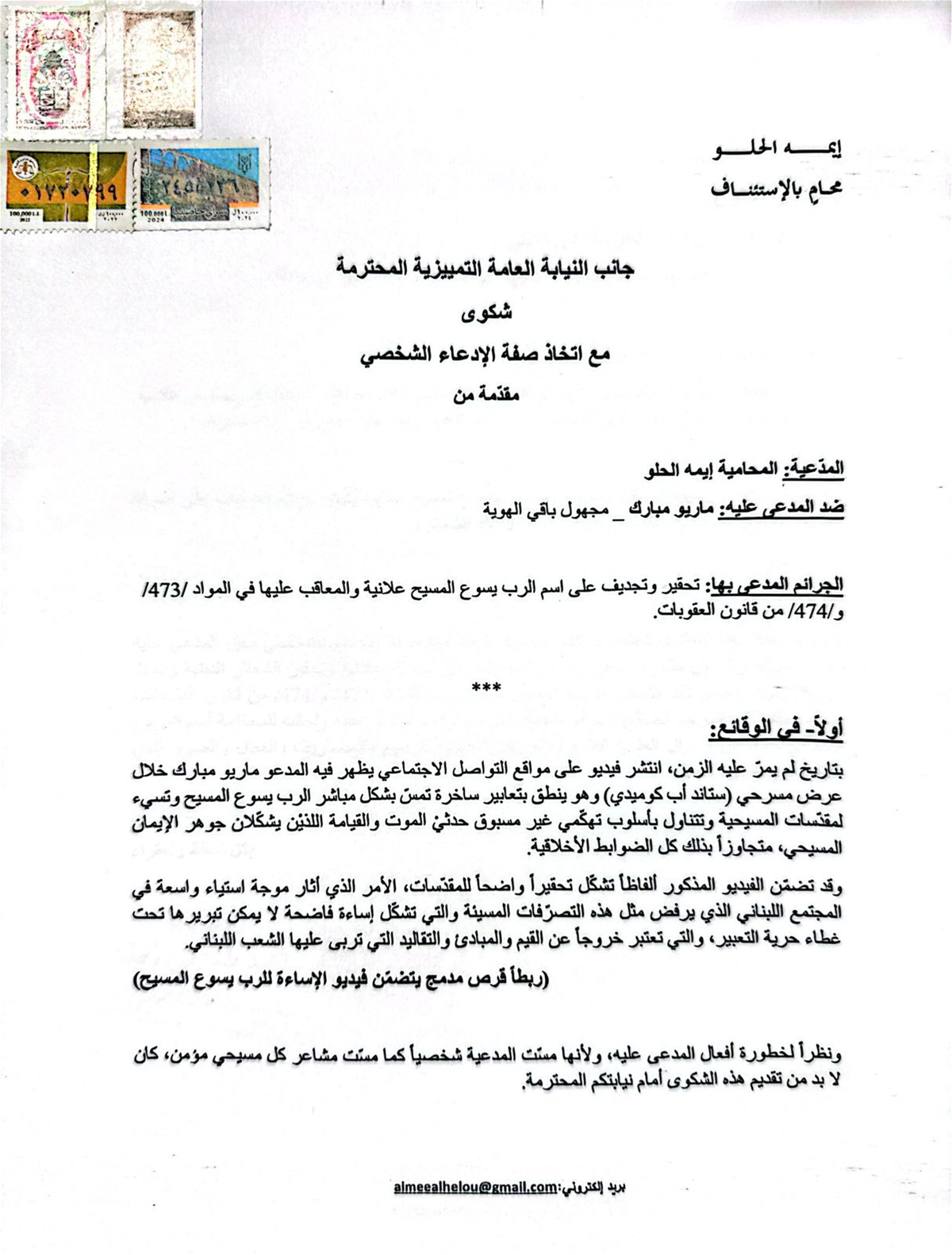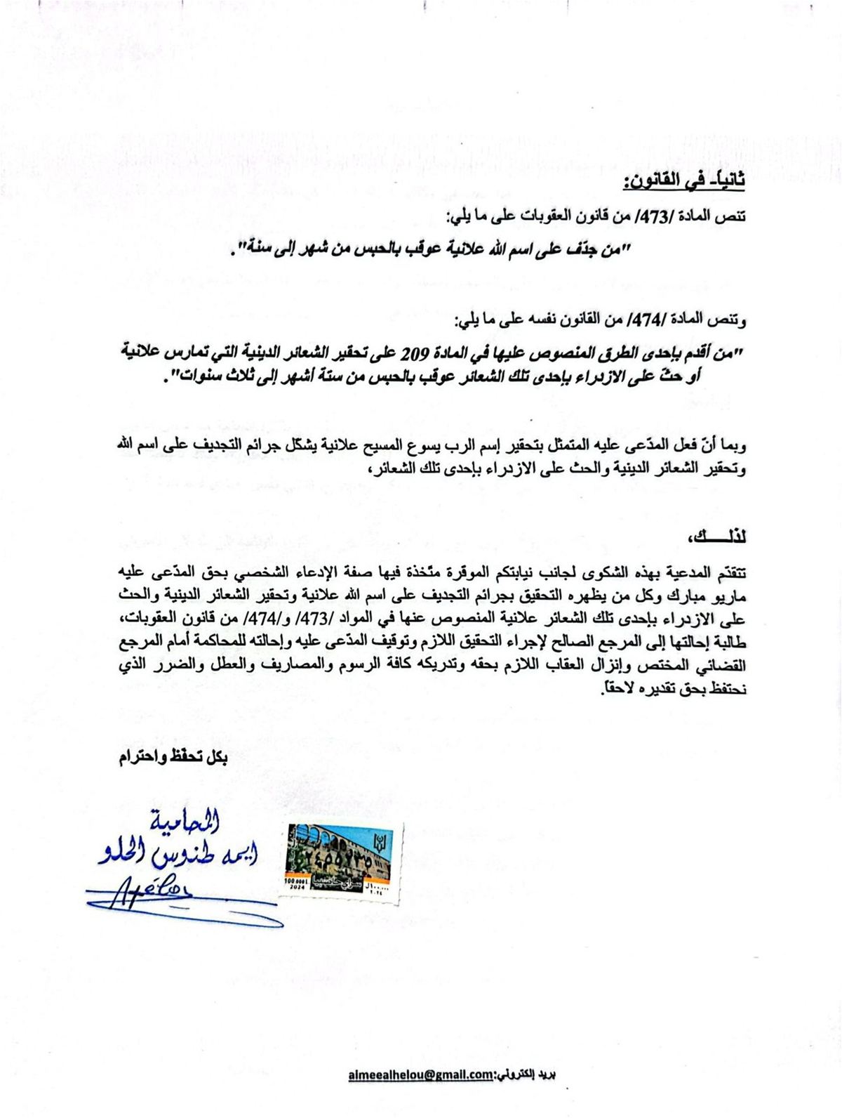 متّخذة صفة الادعاء الشخصي بوجه المدعى عليه ماريو مبارك، بـ"جرائم تحقير وتجديف على اسم "
