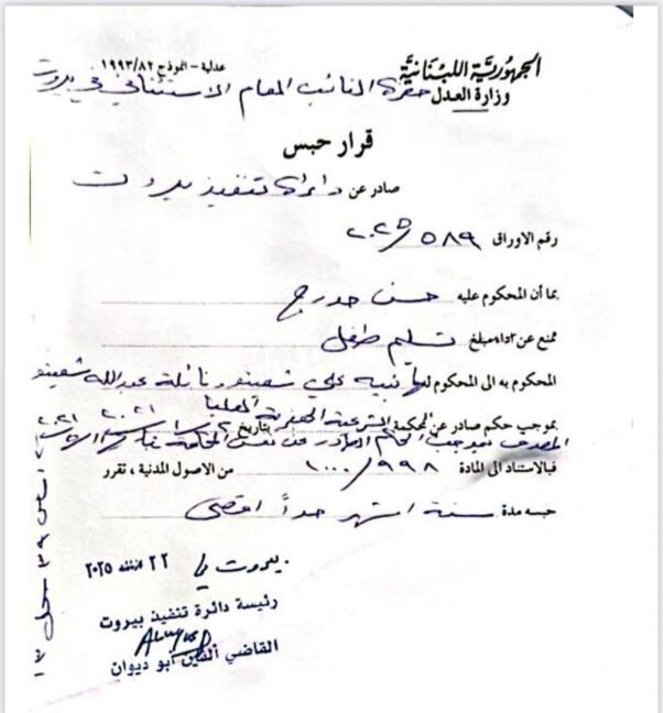 ستة أشهر، بعد ثبوت امتناعه عن تنفيذ حكم قضائي سابق يقضي بتمكين ليليان من رؤيتة طفلها، وقيامه بتهريب الطفل إلى مكان غير معلوم خارج البلاد.