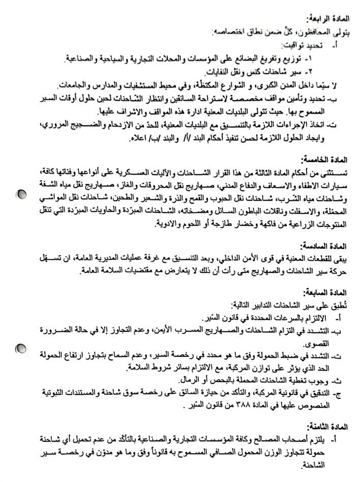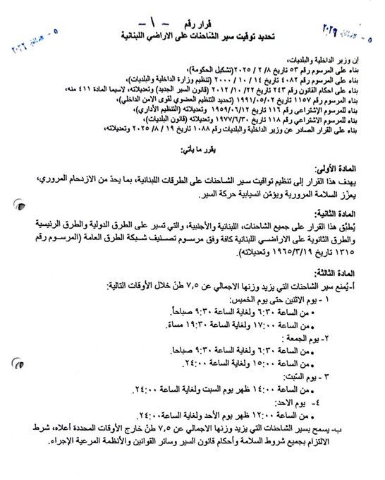عممت وزارة الداخلية والبلديات على حسابها على منصة "إكس"، القرار رقم 1 تاريخ 2026/1/5 حول تنظيم إجراءات وتوقيت سير الشاحنات على الأراضي كافة.