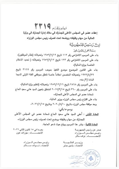 الإدارة الجديدة للجمارك تباشر مهامها والقزي توقع على المعاملات (مستند)