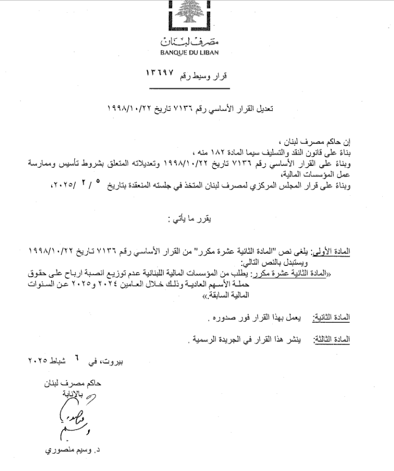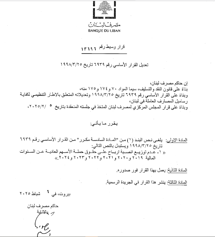 ، تعميماً الى المصارف وآخر للمؤسسات المالية، يمنع بموجبهما توزيع أنصبة الأرباح عن السنوات من 2019 وحتى