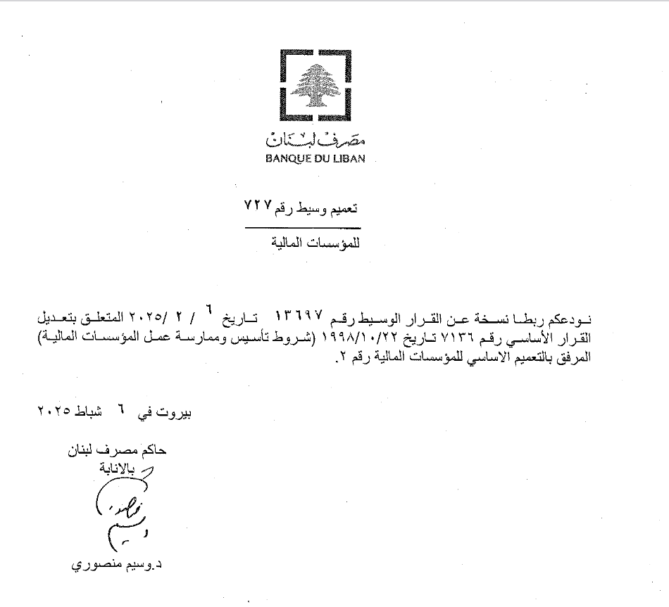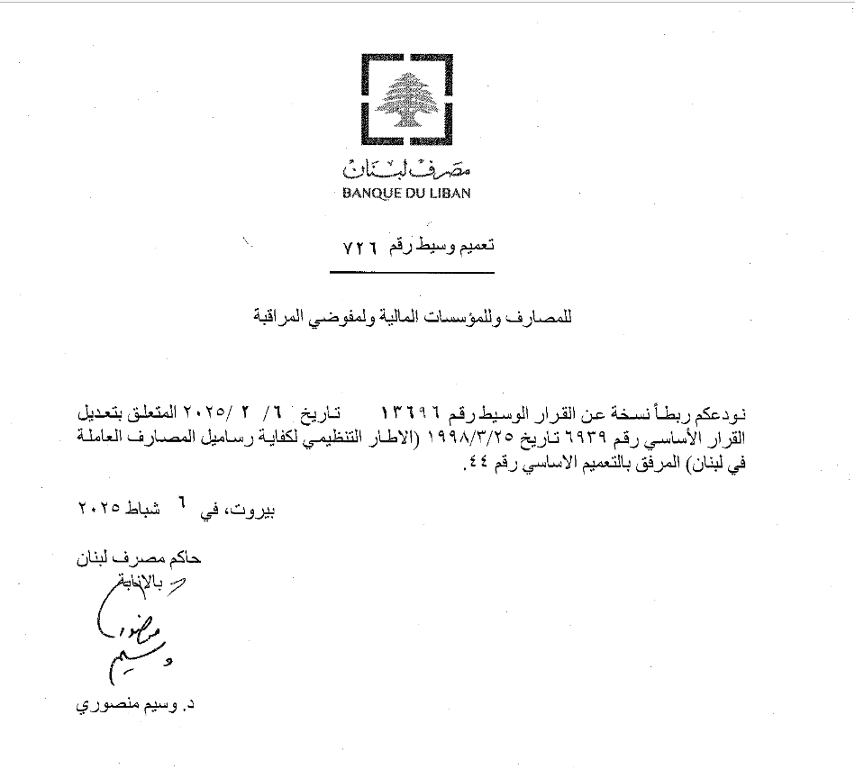 تعميمان لمصرف لبنان موجهان للمصارف والمؤسسات المالية ومفوضي المراقبة