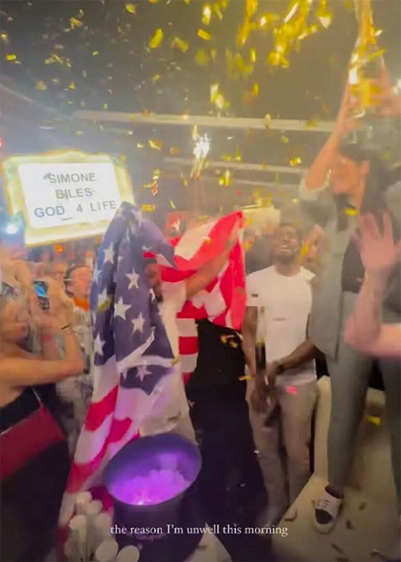وكانت بايلز نشرت آنذاك صوراً لها مع العائلة والأصدقاء، وثانية وهي ترقص مع شقيقتها أدريا في الملهى، وثالثة تم التقاطها على طاولتها الخاصة تُظهر لافتات كتب عليها "سيمون بايلز إلهة الحياة" و"أسطورة الصالة الرياضية".