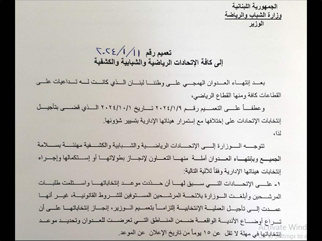 الشباب والرياضة الدكتور جورج كلّاس التعميم رقم 11/1/2024 تاريخ 28/11/2024، الموّجه الى الإتحادات الرياضية والشبابية والكشفية كافة، بشأن مواعيد انتخابات هيئاتها الإدارية وإطلاق أنشطتها، وجاء فيه: