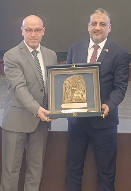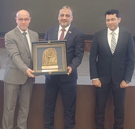 المكتب التنفيذي لمجلس وزراء الشباب والرياضة العرب وزير الشباب والرياضة المصري الدكتور اشرف صبحي ووزير الشباب والرياضة العراقي الدكتور احمد محمد المبرقع دروعاً تقديرية لكل من عضويّ اللجنة الشبابية