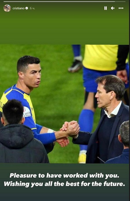 فقد نشر رونالدو، صورة عبر خاصية "ستوري" على إنستغرام، تجمعه بغارسيا، وعلق عليها "من دواعي سروري العمل معك .. أتمنى لك التوفيق"، علماً أنه خاض 12 مباراة تحت قيادته في جميع المسابقات فسجل 11 هدفا وصنع هدفين آخرين.