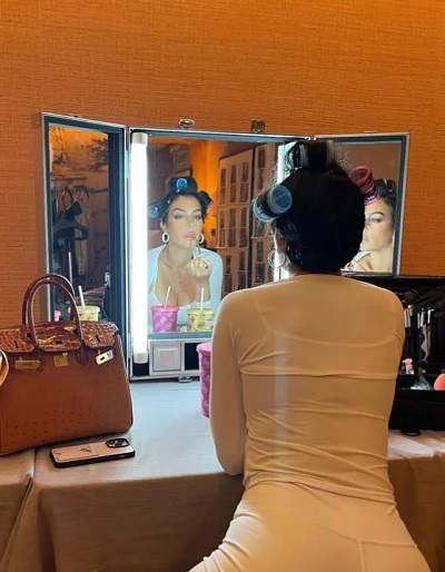 وامكن رؤية عارضة الازياء جالسة على كرسي مع تغطية الجزء العلوي من جسدها بحمالة صدر فقط، واظهرتها صور أخرى متوهجة أثناء قيامها بوضع مكياجها أمام مرآة مضاءة جيداً.