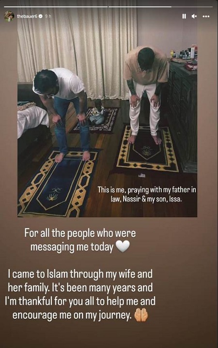 عيسى، لقد دخلت الإسلام عن طريق زوجتي وعائلتها، لقد مرت سنوات عديدة وأنا ممتن لكم جميعا لمساعدتي وتشجيعي في رحلتي".
