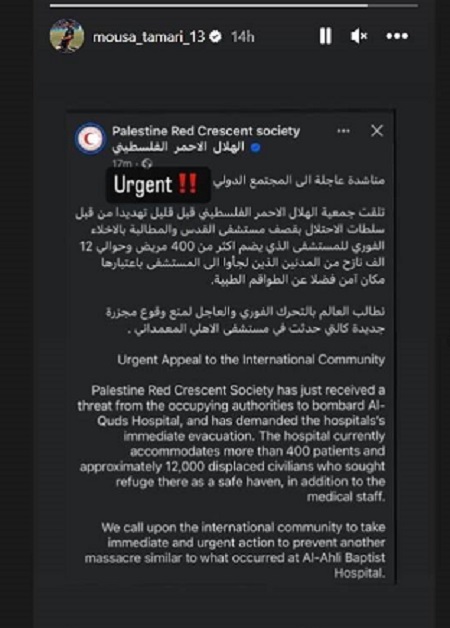 فقد أعاد التعمري نشر تدوينة للهلال الأحمر الفلسطيني عبر خاصية "ستوري" على "