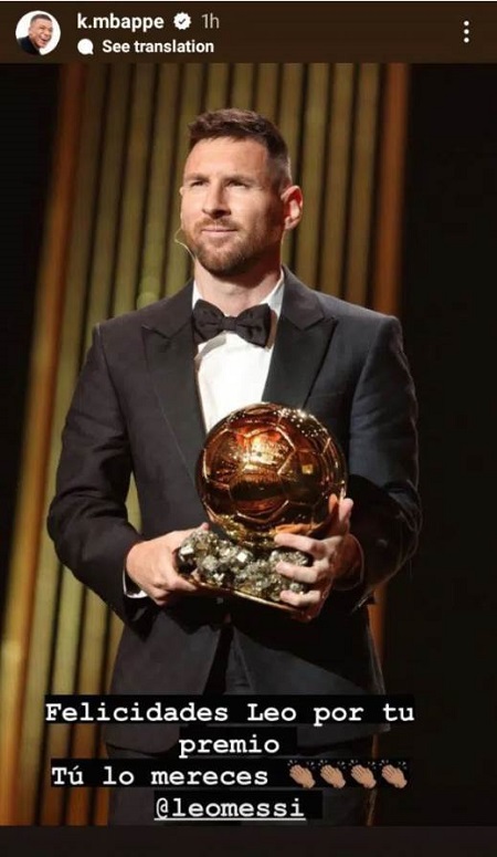 وعلق مبابي، على فوز لاعب إنتر ميامي الأميركي حالياً بالكرة الذهبية للمرة الثامنة في تاريخه، حيث نشر عبر إنستغرام، صورة لزميله السابق في سان جيرمان، وهو يحمل الكرة الذهبية، وعلق عليها "تهانينا ليو على الجائزة، أنت تستحقها".
