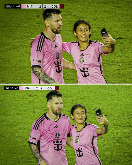 ميسي، الذي شارك في الشوط الثاني بعد العودة من الإصابة وسجل احد الهدفين، فحضنها والتقط صورة سيلفي معها قبل مغادرتها