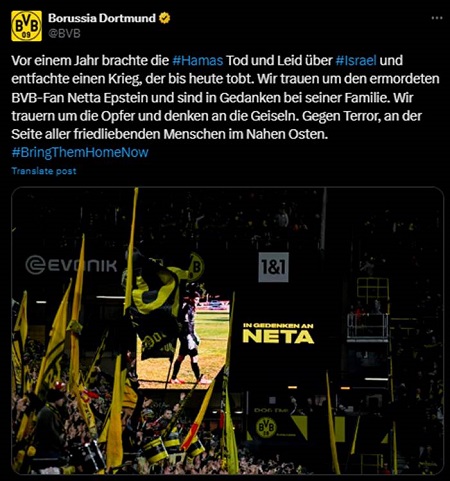 وكتب نادي بروسيا دورتموند على حسابه على منصة إكس "قبل عام، جلبت #Hamas الموت والمعاناة إلى #Israel وأشعلت حربا مستعرة حتى يومنا هذا. نحن نحزن على مشجع BVB المقتول