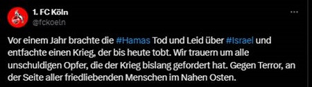أما نادي كولن فكتب على المنصة نفسها "قبل عام، جلبت #Hamas الموت والمعاناة إلى #Israel وأشعلت حربا مستعرة حتى يومنا هذا. إننا نحزن على جميع الضحايا الأبرياء الذين أودت بهم الحرب حتى الآن. ضد الإرهاب، إلى جانب جميع الشعوب المحبة للسلام في الشرق الأوسط".