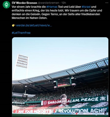 فيردر بريمن "قبل عام، جلبت #Hamas الموت والمعاناة إلى #Israel وأشعلت حربا مستعرة حتى يومنا هذا. نحن نحزن على الضحايا ونفكر في الرهائن. ضد الإرهاب، إلى جانب جميع الشعوب المحبة للسلام في الشرق الأوسط".