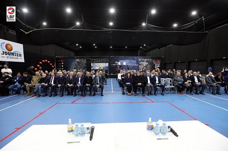 النشيد الوطني افتتاحاً، فكلمة عريف الحفل الاعلامي راوي سابا، رحب فيها بالحاضرين، بإسم رئيس بلدية جونيه الشيخ جوان حبيش وبإسم رئيس اتحاد كرة السلة اكرم حلبي، ثم عُرض التصميم من "شركة زاك للهندسة والتشييد" ورئيس مجلس ادارتها المهندس زياد ابو شبكة عبر فيديو قصير نال اعجاب الحاضرين.