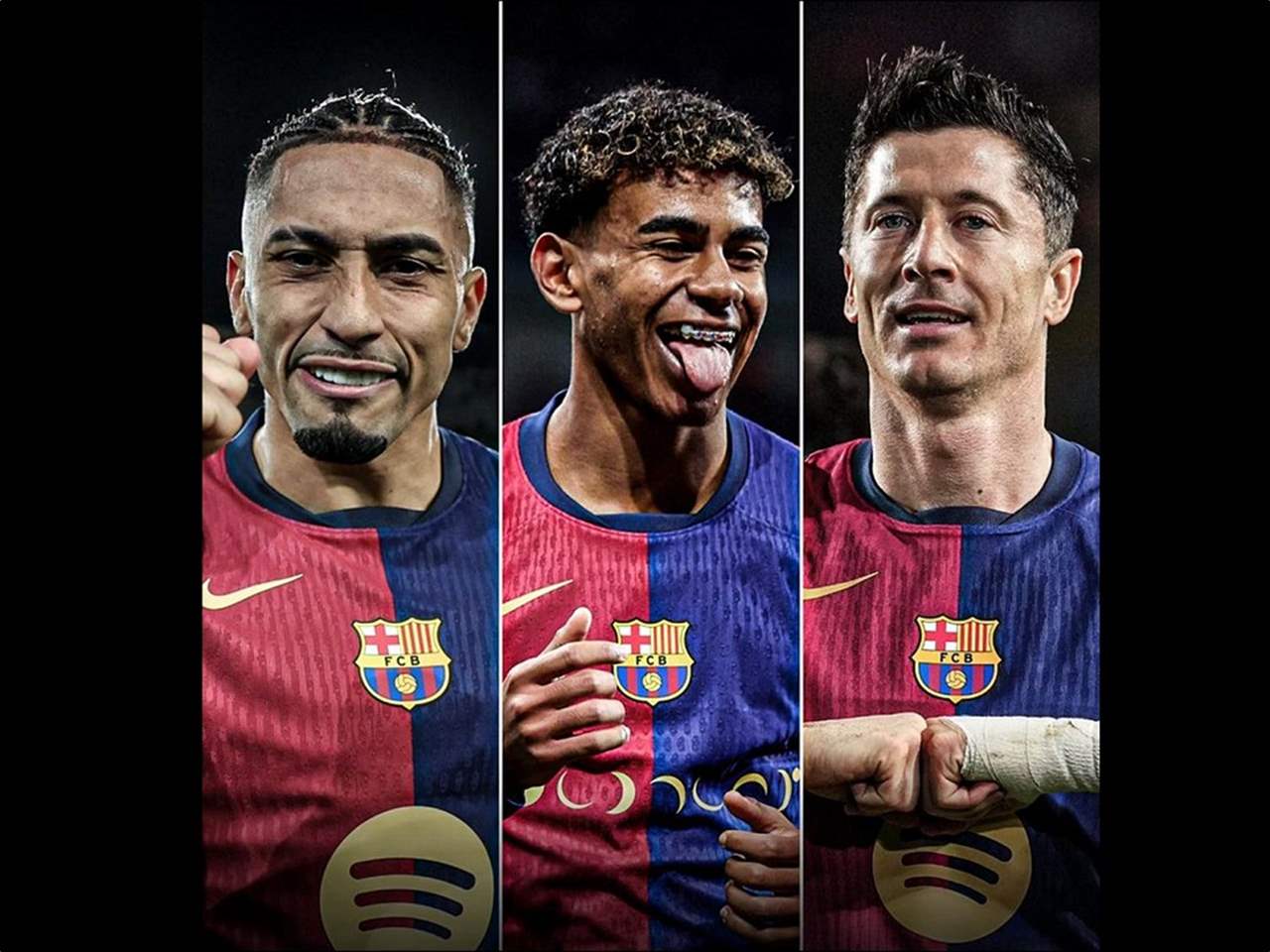 واصل ثلاثي برشلونة، البولندي روبرت ليفاندوفسكي والبرازيلي رافينيا والاسباني لامين يامال تسجيل الأرقام الفلكية في موسم كرة القدم الجاري.